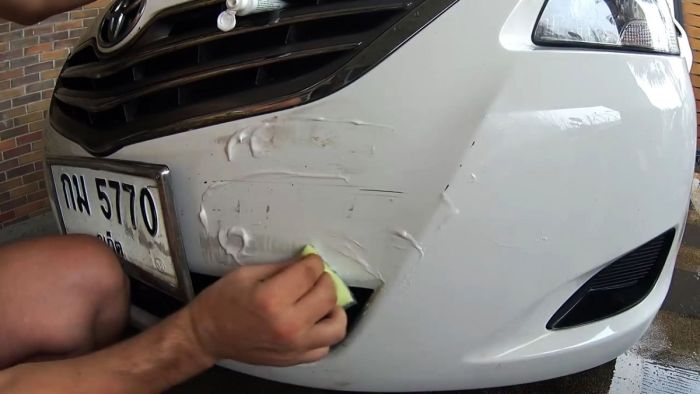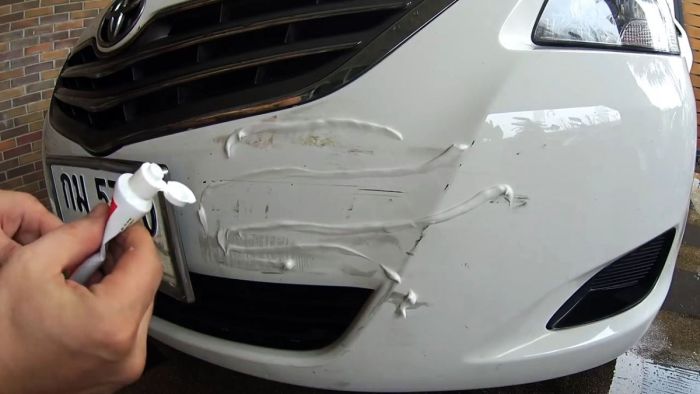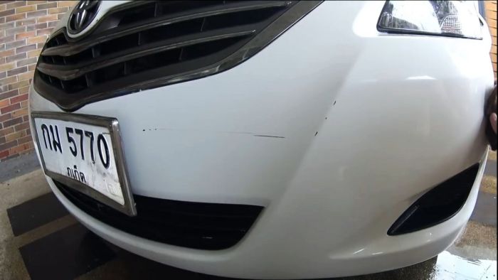 Конечно, чуда жать не стоит: глубокие царапины не исчезнут, так как из-под них виднеется основание бампера.