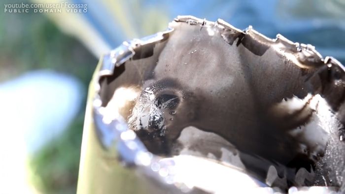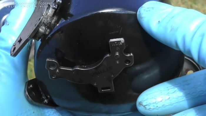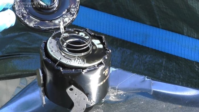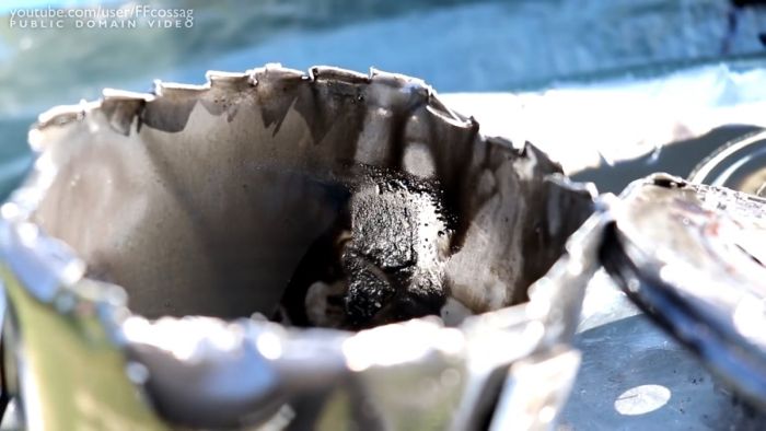 Для проверки обвешанного магнитами фильтра, его корпус нужно вскрыть. Его категорически нельзя распиливать, поскольку тогда внутрь попадут опилки, которые и притянутся магнитом, нарушив чистоту и объективность эксперимента. Для вскрытия нужно приставить отвертку к верхней части корпуса фильтра и пробить отверстие ударами молотка. Расширив его, следует завести ножницы по металлу или кусачки и вскрыть корпус по кругу как консервную банку. При этом важно не снимать магниты, чтобы вся притянутая стружка оставалась на месте, а не вытекла с остатками масла, что осложнит осмотр.