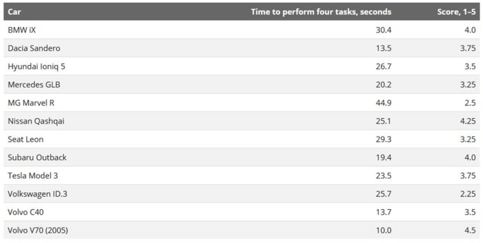 Выяснилось, что участники эксперимента тратили меньше всего времени на задания на Volvo V70 без сенсорных элементов — в среднем на это уходило 10 секунд. Больше всего времени пришлось потратить водителям китайского электромобиля MG Marvel R с большим монитором посередине — 44,9 секунды. За это время автомобиль успевал проезжать почти полтора километра. Примечательно, что довольно близкие результаты к машине 2005 года показали две современные модели с сенсорным экраном. Так, на Dacia Sandero (европейская версия Renault Sandero) на задания в среднем тратили 13,5 секунды, а на Volvo C40 — 13,7 секунды.