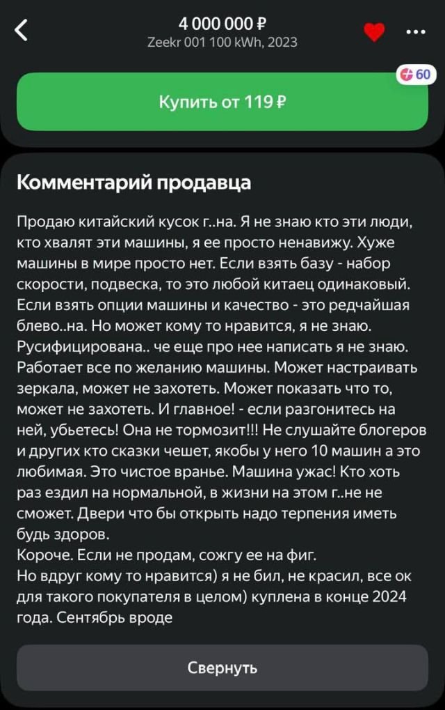 Владельцу Zeekr надоела его машина, и он решил ее продать, поделившись в комментариях душераздирающей историей. Он уверяет, что это «самая ужасная машина в мире», и если он ее не продаст, то просто сожжет. С таким настроем не знаю, кто купит его авто...