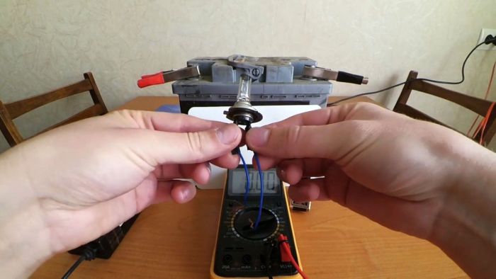 Находим плюс и минус в контактах блока от ноутбука. Подключаем источник к батарее, а в разрыв включаем галогеновую лампу накаливания. Она будет играть роль гасящего резистора.