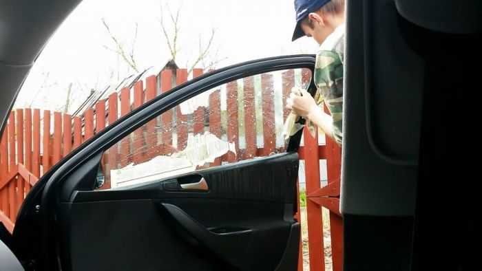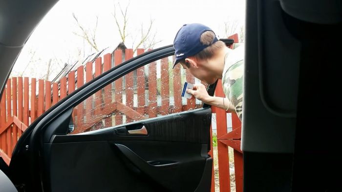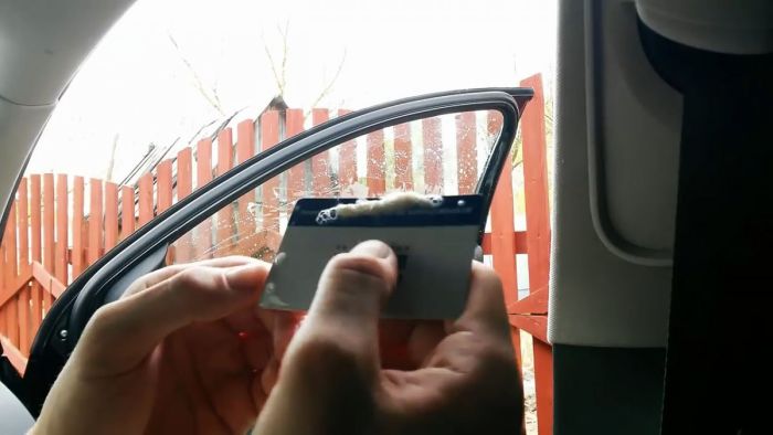 Намочите окно автомобиля мыльным раствором по всей площади. Не оставляйте пропусков не бойтесь, что жидкость будет попадать на уплотнители. Механизмы отрывания/зарывания и подъема окон от небольшого количества влаги не испортятся.