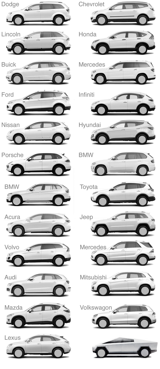 Занимательная картинка, демонстрирующая моду на внешний вид современных кроссоверов. Отчетливо видно, что в профиль они все повторяют друг друга, одно и то же с небольшими изменениями у всех производителей. И отдельно, каким-то гадким утёнком, стоит Tesla Cybertruck.