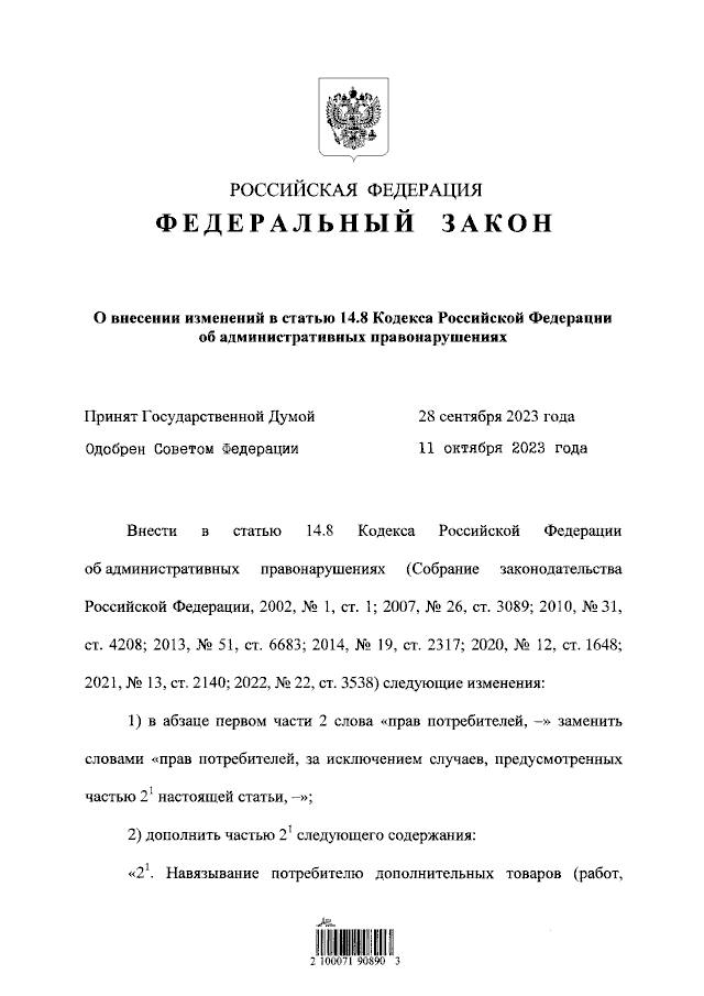 Путин подписал закон, устанавливающий ответственность за навязывание потребителям дополнительных товаров и услуг за дополнительную плату
