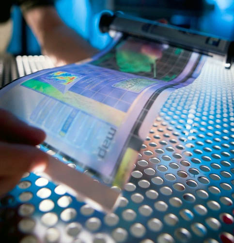 Осталось дело за малым ? за созданием дешевых гибких мониторов, по принципу тех, что недавно представила команда разработчиков из Государственного университета Аризоны и исследователей из HP Labs. В производстве его использован метод самосовмещенной литографии (self-aligned imprint lithography, SAIL), изобретенный в HP Labs: структура подложки, на которой формируется будущая пластиковая микросхема, сама обеспечивает тончайшее выравнивание всех ее элементов. Это немного напоминает обычную типографскую печать ? гибкий массив пластиковых транзисторов буквально печатается на матрице, делая весь процесс быстрым и недорогим.