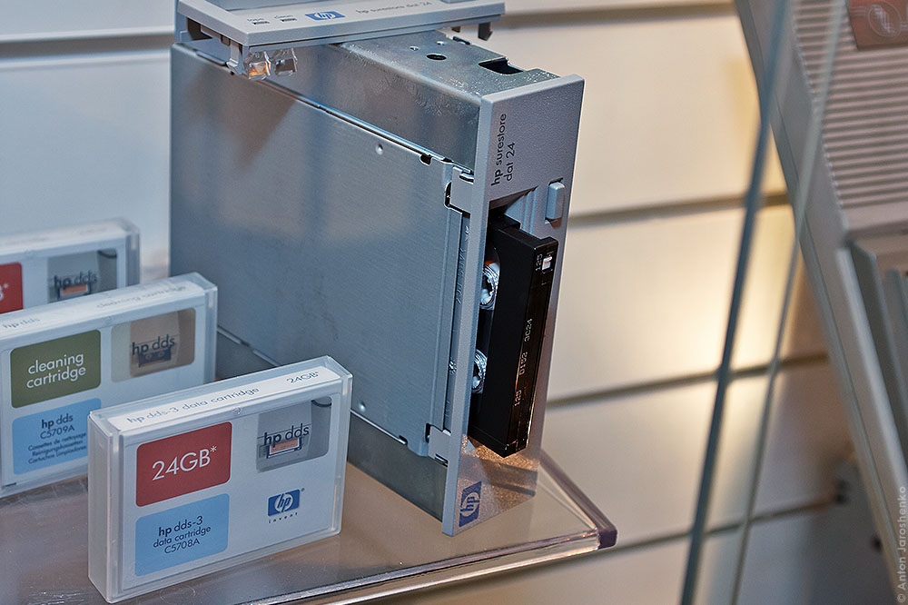 Стример. По сути компьютерный магнитофон. У такого носителя большой объем, но медленная скорость чттения/записи. Такие девайсы производятся до сих пор. Такие накопители используются для резервного копирования. Максимальный объем который сегодня можно сохранить на такой кассете 35 терабайт.