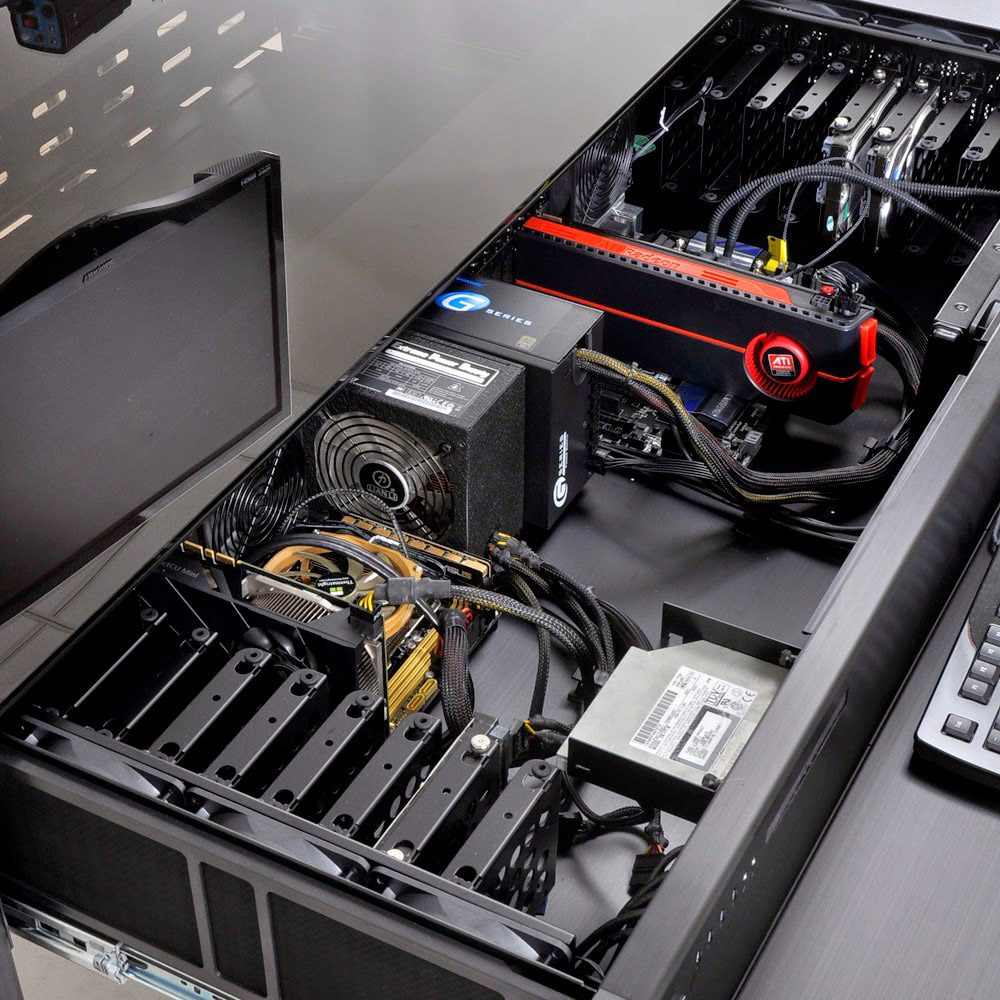 Здесь же придется выложить от 989 до 1190 долларов просто за шасси, без компьютера. Зато можно долго колдовать, распихивая до 12 жестких дисков и даже установить сразу две материнских платы! Два блока питания! Подсветку! Водянку!
