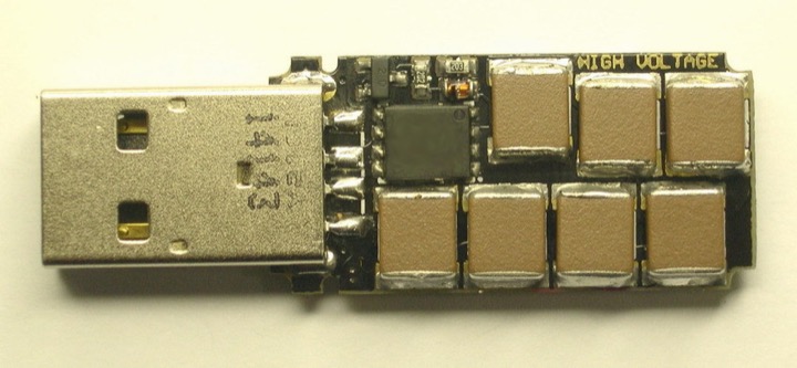 Принцип работы самой флешки довольно прост. При подключении к USB порту запускается инвертирующий DC/DC преобразователь и заряжает конденсаторы до напряжения -110в, при достижении этого напряжения DC/DC отключается и одновременно открывается полевой транзистор через который -110в прикладываются к сигнальным линиям USB интерфейса. Далее при падении увеличении напряжения на конденсаторах до -7в транзистор закрывается и запускается DC/DC. И так в цикле пока не пробьётся всё и вся. Пытливый ум читателя знакомого с электроникой уже сообразил, почему используется отрицательное напряжение, для прочих поясню, что отрицательное напряжение коммутировать проще, так как нужен N-канальный полевой транзистор, который в отличие от P-канального может иметь значительно больший ток при одинаковых габаритах.