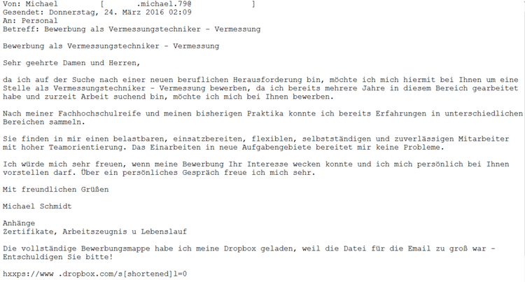 Petya преимущественно атакует специалистов по кадрам. Для этого злоумышленники рассылают фишинговые письма узконаправленного характера. Послания якобы являются резюме от кандидатов на какую-либо должность. К письмам прилагается ссылка на полное портфолио соискателя, файл которого размещается на Dropbox. Разумеется, вместо портофлио по ссылке располагается малварь – файл application_portfolio-packed.exe (в переводе с немецкого).