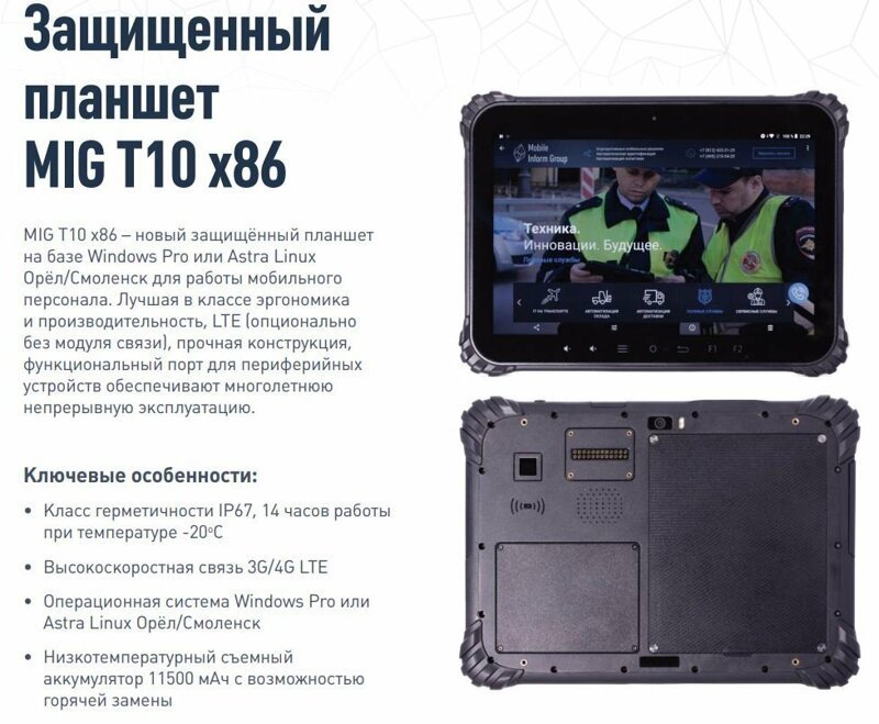 Неделю назад российская компания Mobile Inform Group представила новый отечественный защищенный планшет MIG T10×86. Ударопрочная новинка может работать не только на Windows, но и на Astra Linux, а значит сертифицирован для работы у госструктур и соответствует всем требованиям безопасности СЗИ ФСТЭК, Минобороны и ФСБ России.