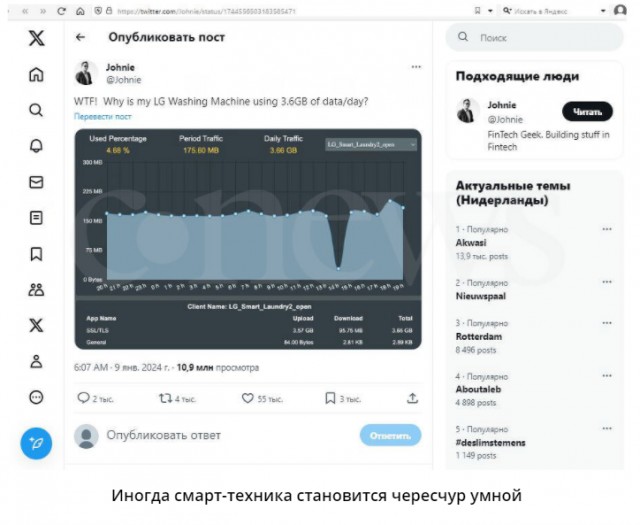 С таким необычным поведением столкнулся пользователь заблокированной в России соцсети Х, она же Twitter, под псевдонимом Johnie (@Johnie). В своем блоге он обрисовал ситуацию, и его пост, опубликованный 9 января 2024 г., мгновенно стал популярным. К моменту выхода материала он набрал более 2 тыс. комментариев, 4 тыс. репостов, 55 тыс. отметок «Нравится», и как минимум 3 тыс. пользователей добавили этот пост в «Избранное».