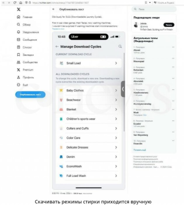В процессе поиска истины Johnie обнаружил два факта, один любопытнее другого. Первый заключается в том, что его стиральная машина по умолчанию не поддерживает целый ряд привычных многим режимов стирки – их приходится скачивать дополнительно.