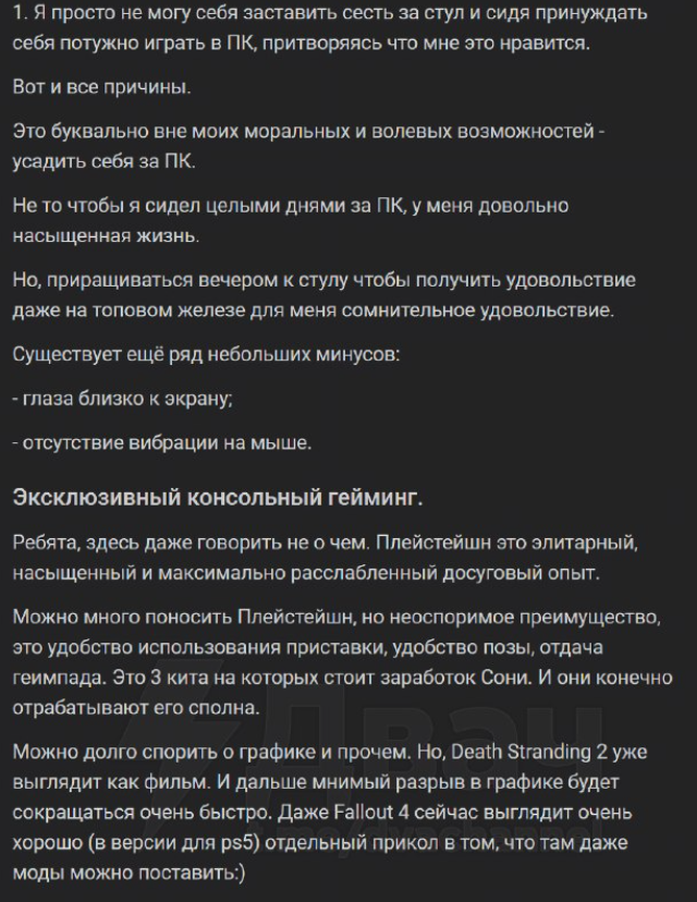 Основная причина заключается в том, что комфорт имеет для него первостепенное значение: ему не хочется сидеть на стуле, уставившись в экран, а использование мыши не приносит ему желаемого ощущения. В то время как игровая приставка предоставляет возможность удобно устроиться на диване и расслабиться.