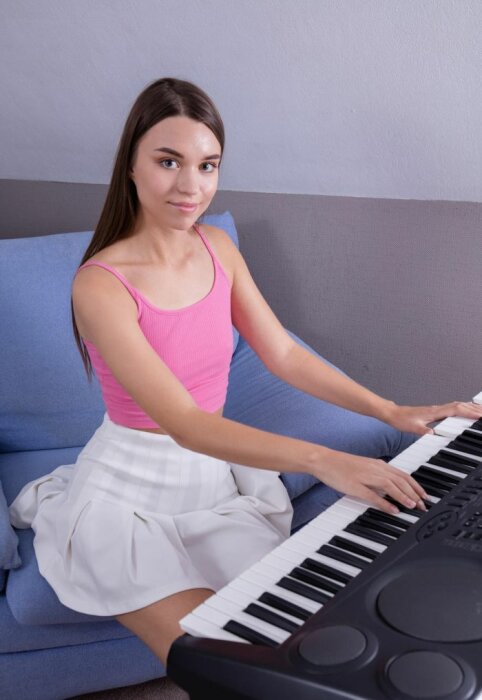 Неторопливо стягивая с себя кружевной наряд, молодая белобрысая шалунья с упругой попой раздевается до гола. Развратно изгибаясь на диване в разных позах, девушка без комплексов совершенно открыто демонстрирует нам свои прелести.