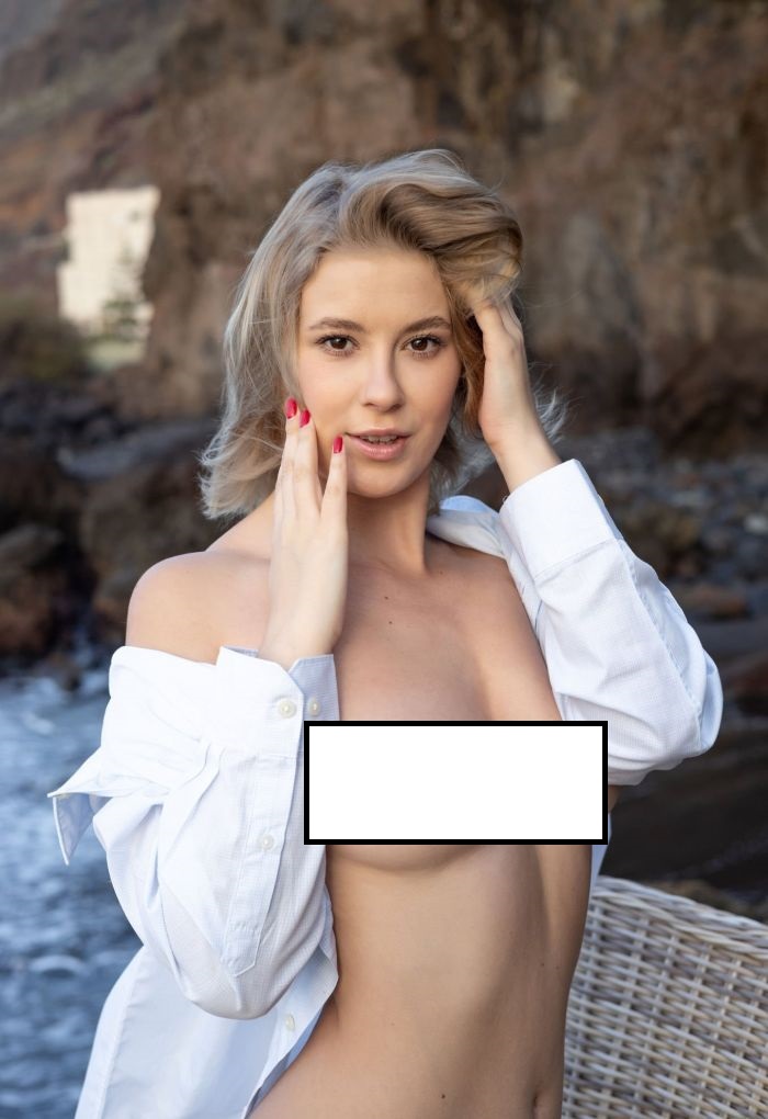 Свободно чувствуя себя перед камерой, привлекательная женщина с выставленной на показ сексуальной грудью позирует в рубашке на голое тело и без стеснения демонстрирует нам свое тело на фоне моря…
