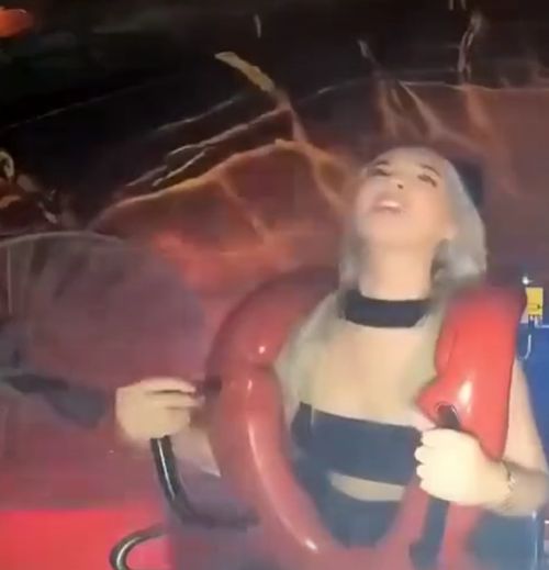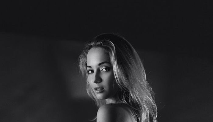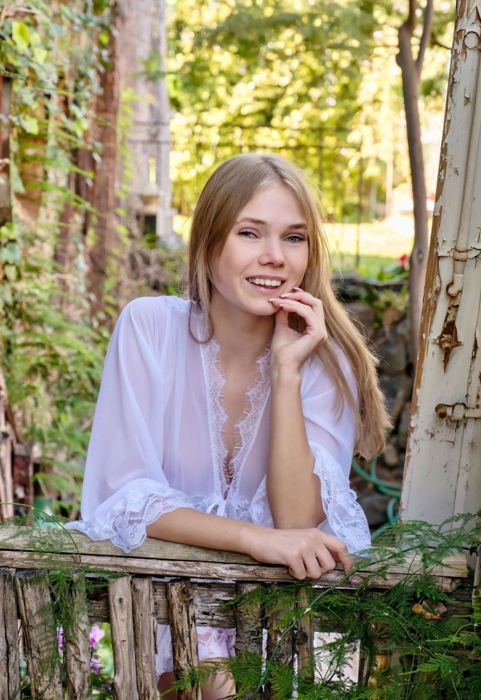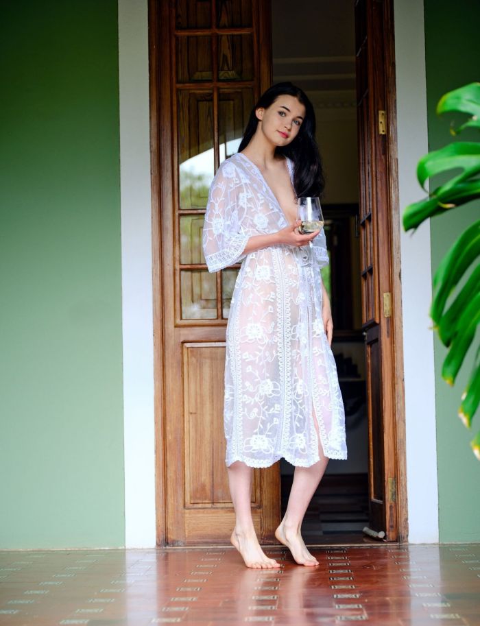 Представ перед нами в распахнутом кружевном халатике, обнаженная девушка с сексуальной грудью развратно извивается в разных позах на лестнице и, не стесняясь глазеющих на нее соседей, во всей красе светит ухоженными прелестями.