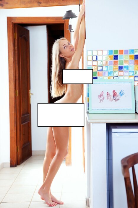 Активно извиваясь в самых откровенных и неприличных позах, голая девушка с сексуальной грудью похотливо прогнулась раком на кухонном столе и приглашающе выпячивает вперед свою подтянутую попку.