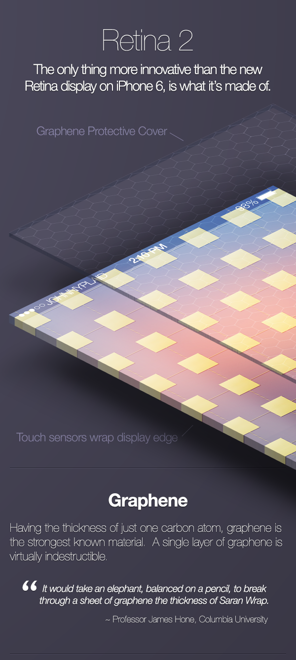 Дизайнеры - народ весьма интересный и креативный. Взять, к примеру, очередной концепт яблочного смартфона iPhone 6. Внешне гаджет получился довольно привлекательным и при равных физических размерах корпуса iPhone 5 в характеристиках описываются просто невозможные на сегодняшний день решения. Даже скорее - фантастические. Смартфон "получит" безрамочный 4.5-дюймовый дисплей Retina 2 с нестандартным разрешением 754 х 1296 пикселей (333 dpi), два 4-ядерных процессора Apple A7 с частотой по 2.8ГГц, 4ГБ оперативной памяти работающей на частоте 1600 МГц, от 32ГБ до 128ГБ встроенной памяти, две камеры на 8 и 20 мегапикселей, а так же, непонятно куда установленный аккумулятор ёмкостью 2800 мАч. По фантазиям автора, iPhone 6 будет в 4 раза быстрее чем iPhone 5 и в 2 раза быстрее Samsung Galaxy S4.