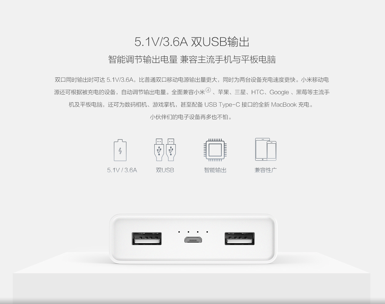 Нет пауэрбанков лучше, чем пауэрбанки от Xiaomi. По крайней мене по соотношению цена/качество. Но ребята не сидят на месте и выпустили новый, еще круче! Новая модель имеет ёмкость 20 000 мАч, чего может хватить не только на 7+ полных зарядок iPhone 6S и 2-3 зарядки iPad Mini, но и на зарядку Macbook! При этом вес устройства составляет 338 грамм, что намного меньше, чем вес двух пауэрбанков по 10 000 мАч. Кроме этого устройство имеет два выхода USB - под ток а 1.2 А и ток в 2 А, так что можно одновременно быстро заряжать и смартфон, и планшет. Внутри традиционно качественные современные батареи производства LG или Panasonic.