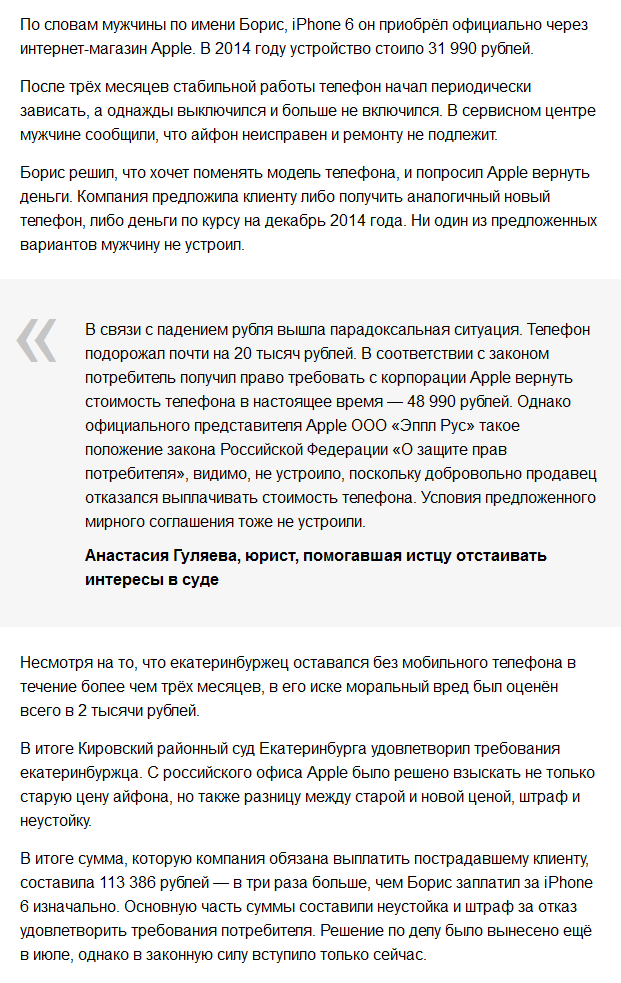 Купивший в прошлом году iPhone 6 у российского представительства Apple житель Екатеринбурга подал на компанию в суд, так как его телефон оказался неисправным, а убытки не были возмещены. В итоге парень сумел отсудить сумму в три раза больше, чем изначально отдал за телефон, сообщает городской портал e1.