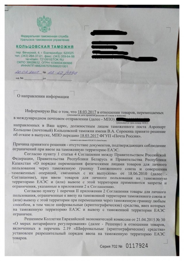Пользователь решил самостоятельно разобраться в возникшей проблеме. После того, как он обратился в ФТС с требованием разъяснить, почему его покупка была возвращена обратно производителю, таможенники в своём ответе сослались на «Таможенный кодекс Таможенного союза (ТС)», согласно которому в перечень почтовых отправлений, запрещённых к пересылке, относятся «контрафактные и пиратские предметы». В связи с чем, в посылке, адресованной нашему подписчику,