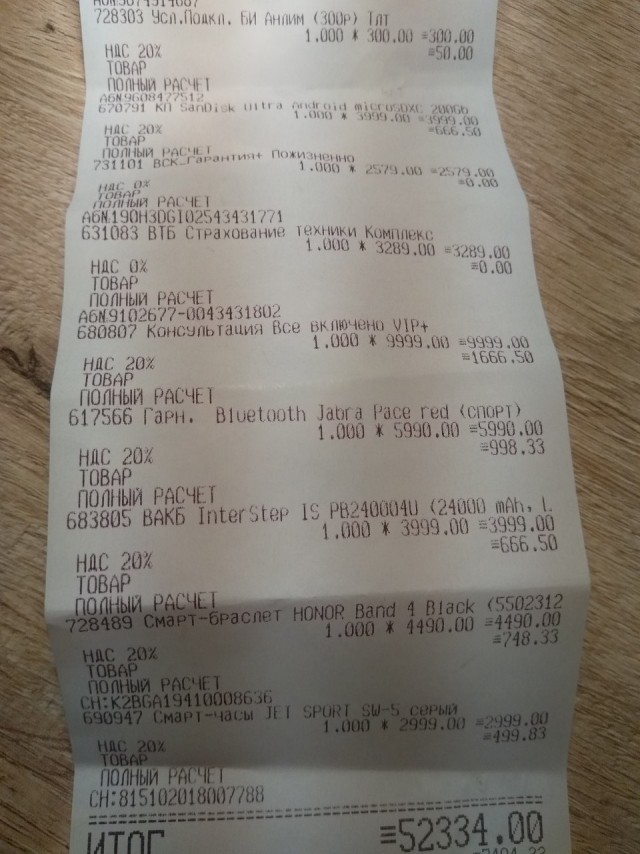 Продавец в салоне связи выбил из женщины 52 тысячи рублей. Консультант уговорил ее на покупку несколько сотовых тарифов, продал внешний аккумулятор, смарт-часы, Bluetooth-гарнитуру. Вишенка на торте – консультация «Все включено VIP+» за 9999 рублей. Родственники женщины обратились в полицию.