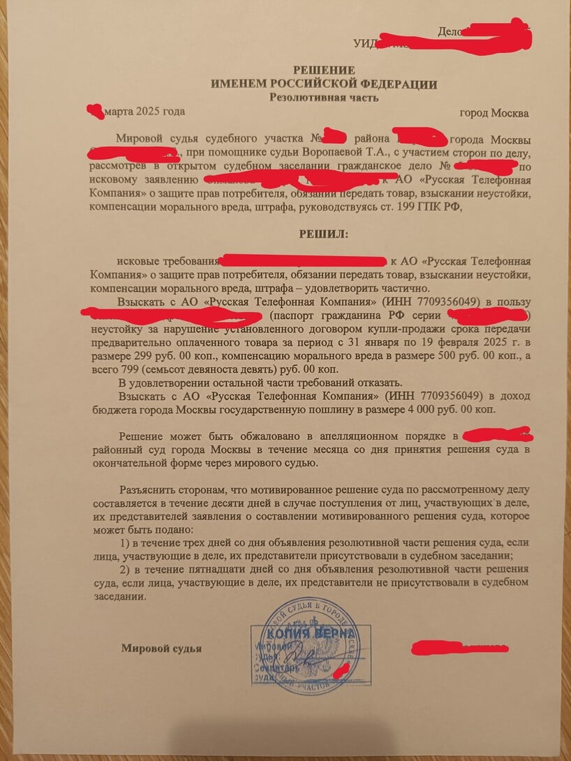⚖️ Суд в итоге встал на мою сторону: телефоны по заказу я получил, плюс назначили компенсацию — 299 ₽ неустойки и 500 ₽ морального. Да, копейки, и штраф не начислили, но обжаловать ради 600 рублей смысла не было.
