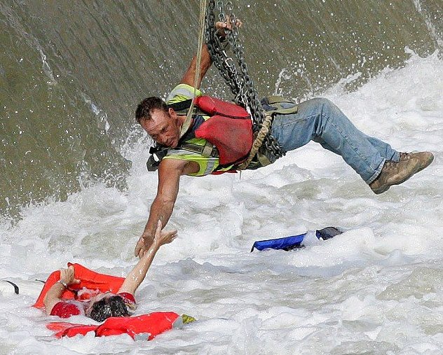 Строители проводили работы на дамбе реки Де-Мойна в штате Айова, акк вдруг один из них Jason Oglesbee заметил женщину в воде. Её куртило водоворотом, не давая выбратся, только спасательный жилет позволял держаться на поверхности и не утонуть. Строитель, не раздумывая бросился на помощь женщине! Прицепившись к крану он опустился к воде и спас её.
