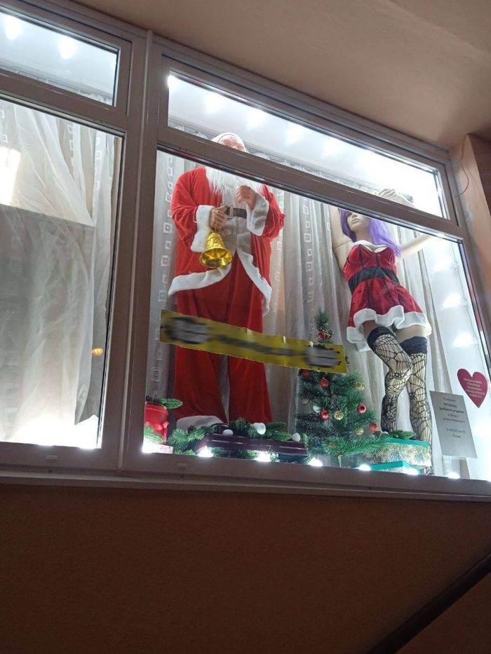Новогодняя витрина одного из магазинов интимных товаров вызвала бурную реакцию у местных жителей. На манекене, облаченном в полупрозрачный пеньюар и чулки, красовался новогодний наряд, напоминающий костюм Снегурочки.