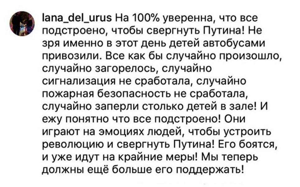 Ну да, нытики вышли на митинг. Всего лишь их дети и родственники сгорели. Нытики! Тоже мне повод требовать правду. Пусть сидят дома и смотрят первый канал!