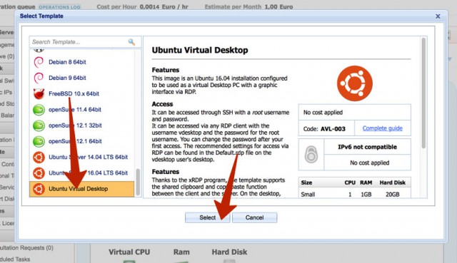 Выберите пункт sеlесt Template. Откроется внушительный список из самых разных дистрибутивов операционных систем. За Windows забудьте, поскольку ее установка обойдется дороже в связи с требования ОС (2 ГБ ОЗУ минимум).