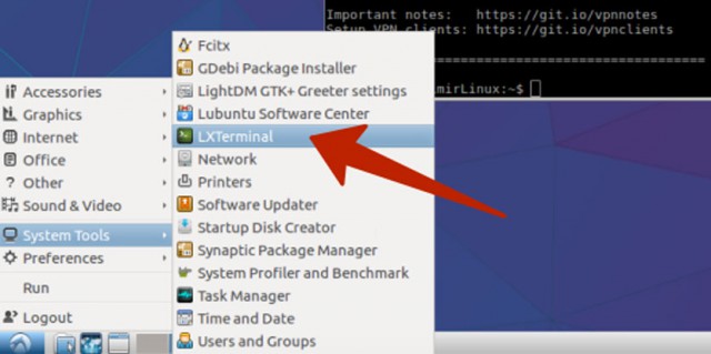 Шаг 1. В левом нижнем углу тапните по пиктограмме (а-ля меню Пуск в Windows). Выберите System Tools —> LXTerminal. В открывшемся терминале введите следующую команду (будьте внимательны):