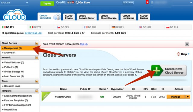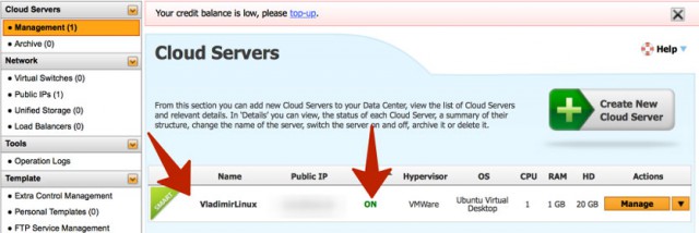Шаг 2. В панели управления на вкладке Managment (на боковой панели) выбираем Create New Cloud Server.