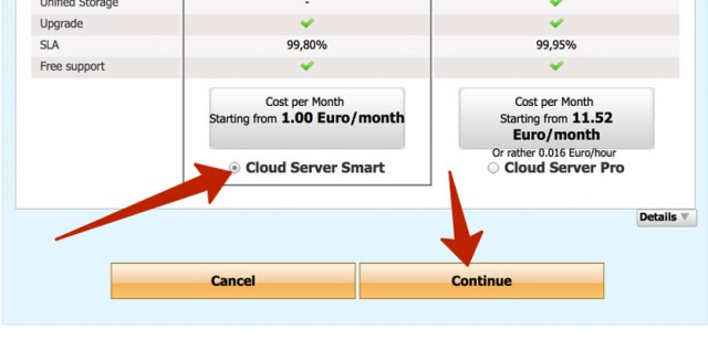 Шаг 3. Выбираем уже знакомый нам Cloud Server Smart стоимостью 1 евро в месяц. Внизу отмечаем этот тариф и нажимаем Continue.