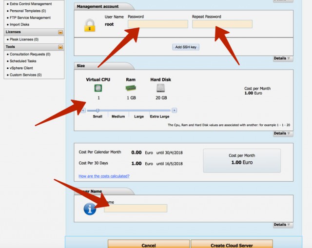 ще раз убедитесь, что выбраны минимальные характеристики сервера и указана стоимость в 1 евро за месяц обслуживания. Не забудьте задать имя вашего сервера – любое, какое угодно, но латинскими буквами. Так будет именоваться ваш удаленный компьютер.