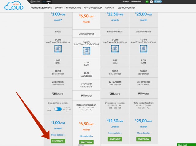Шаг 1. Открываем сайт ArubaCloud.com. и выбираем самый дешевый тарифный план за 1 евро в месяц. Нажимаем Start Now.