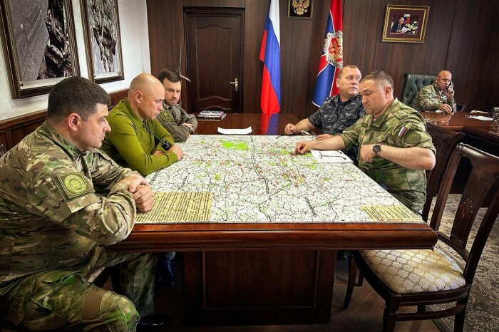 Принадлежащий ЧВК «Вагнер» Telegram-канал «Разгрузка Вагнера» опубликовал кадры встречи своего главы Евгения Пригожина с заместителем министра обороны Российской Федерации генерал-полковником Юнус-Беком Евкуровым и первым заместителем начальника главного управления Генштаба Владимиром Алексеевым. В описании к видео утверждается, что встреча проходит в штабе Южного военного округа ВС РФ в Ростове на Дону. На кадрах они ведут переговоры.