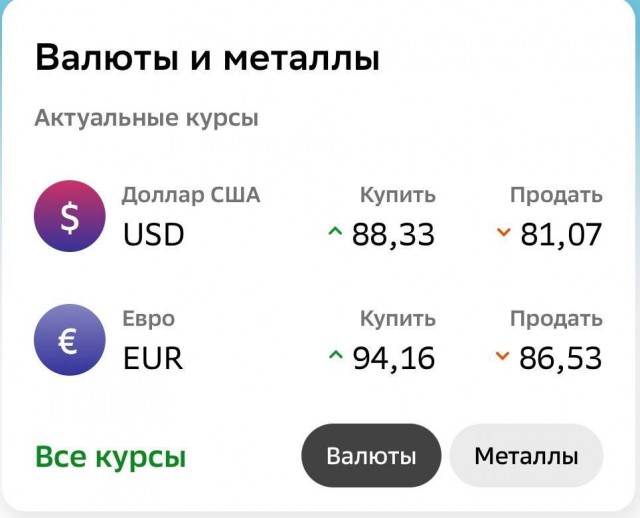 Самые высокие курсы предлагает Росбанк: 105 рублей за доллар и 115 рублей за евро, самые выгодные в Промсвязьбанке - 84,87 и 93,06. В Сбербанке - 88,33 и 94,16 рубля соответственно.