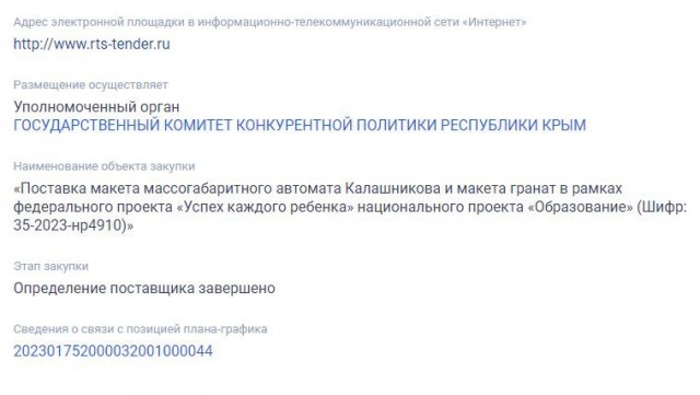 Согласно данным портала госзакупок, региональные управления образования этим летом уже начали закупать массогабаритные макеты автоматов Калашникова и гранат.
