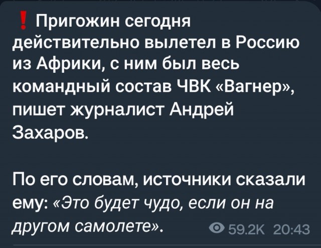 Источник Readovka указывает, что сообщения о смерти Евгения Пригожина на данный момент преждевременные. Информацию о его кончине, а также смерти командира «Группы Вагнера» Дмитрия Уткина, невозможно на данный момент проверить, сообщает источник СМИ.