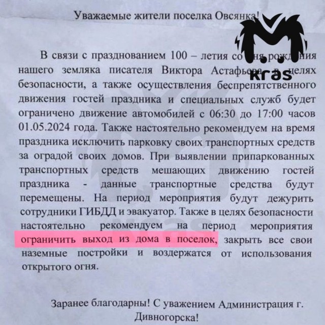 Сегодня открывался Национальный центр Виктора Петровича Астафьева и на дверях одного из магазинов появилось вот такое объявление. Местных просили не суетиться на улице и убрать машины, чтобы не мешать дорогим гостям, среди которых нынешний и бывший губернаторы, депутаты, чиновники.
