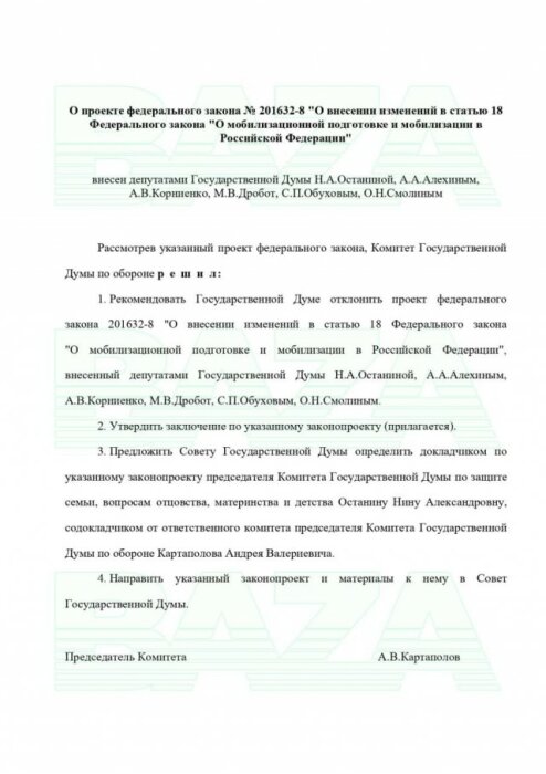 В распоряжении «Базы» появилось заключение Комитета Госдумы по обороне по поводу законопроекта, при котором отсрочка от мобилизации предоставлялась бы гражданам, имеющим на иждивении не 4-х, а 3-х детей в возрасте не до 16-и лет, а до 18-и лет или обучающихся по очной форме обучения до 23-х лет.