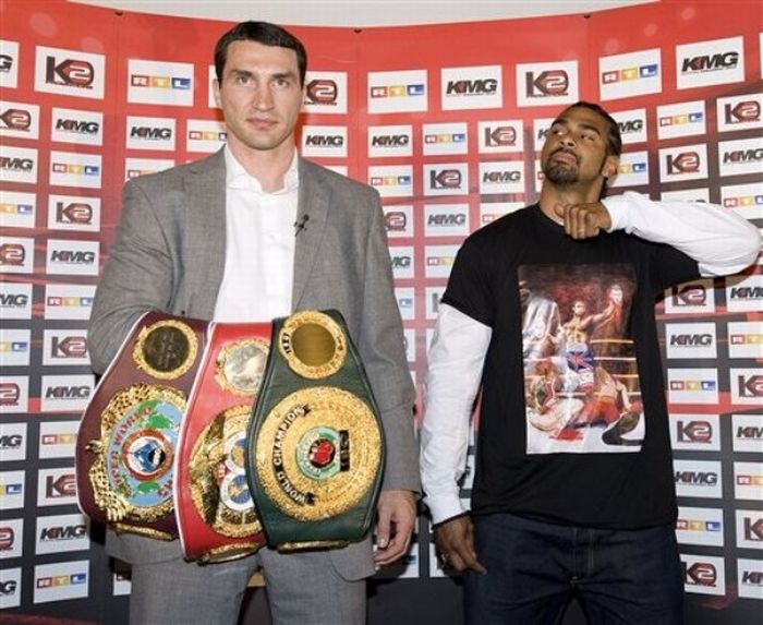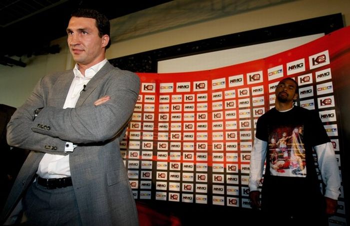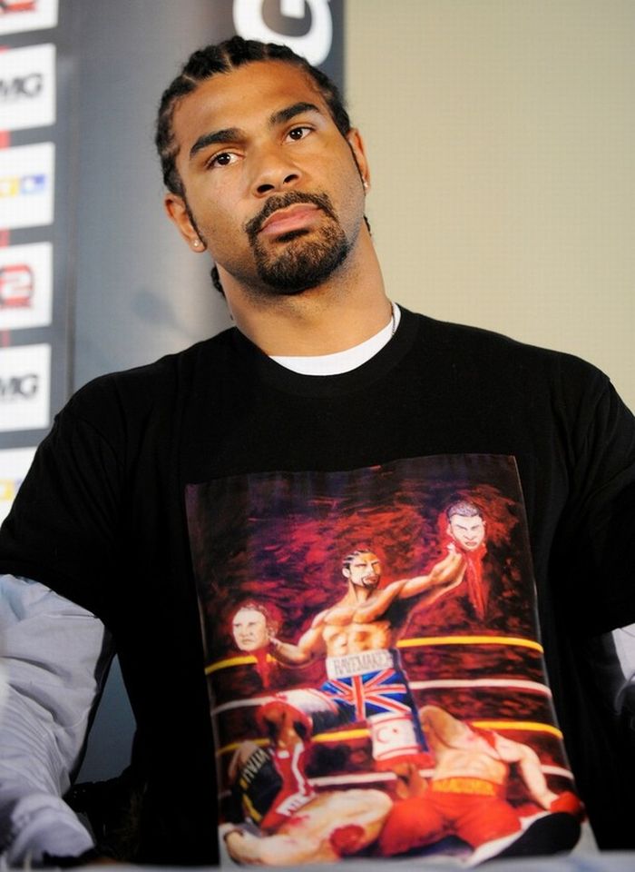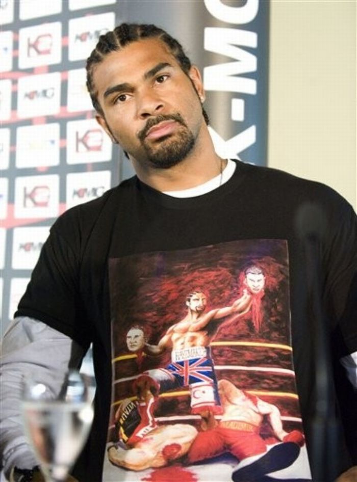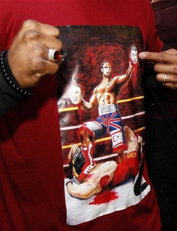 Англичанин пришел в футболке с рисунком, на котором он стоит с оторванными головами братьев Кличко.
