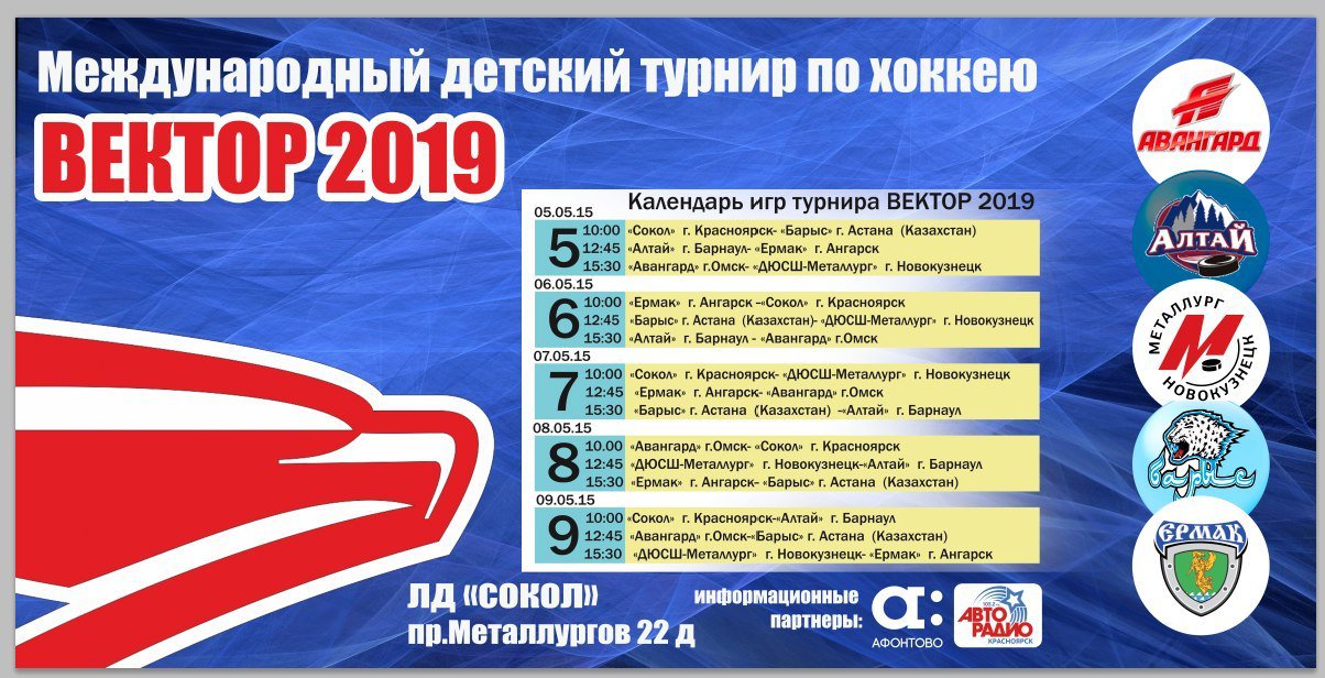 С 5 по 9 мая в Красноярске, в ледовом дворце «Сокол», пройдет второй детский международный турнир по хоккею «Вектор-2019». В соревнованиях примут участие 6 команд — «Авангард» (Омск), «Барыс» (Астана), «Металлург» (Новокузнецк), «Ермак» (Ангарск), «Алтай (Барнаул) и красноярский «Сокол». Возраст участников — 11 лет.