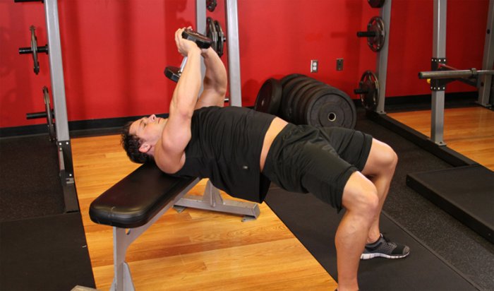 Лягте поперек на горизонтальную скамью лопатками, остальная часть туловища на весу. Гантель держите обеими руками. В начальной позиции, она поднята над головой. Не уроните ее! На вдохе опускайте снаряд за голову, медленно сгибая руки в локтях до достижения параллельной линии со скамьей. На выдохе возвращаемся в исходное положение. Соблюдение паузы между повторами — одна секунда.