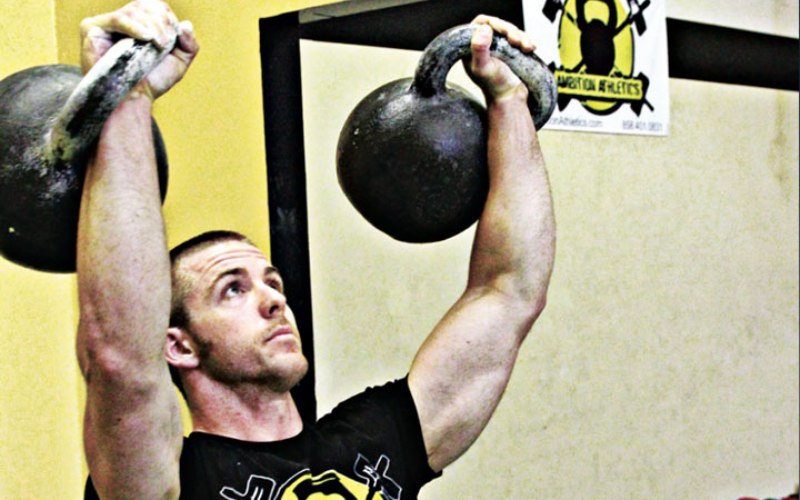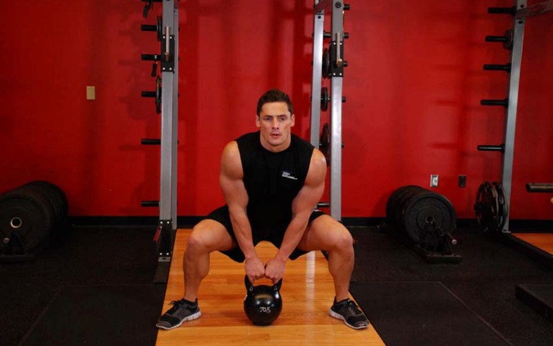 Это упражнение укрепляет те мышцы пресса и торса, которые обычно при занятиях с железом не получают нужную нагрузку, но важны при выполнении различных движений от прыжков до спринта. Возьмите гирю двумя руками, вес тела перенесен на пятки, спина прямая. Заведите гирю между ног и плавно, но быстро выпрямитесь, и выведите гирю на уровень груди.