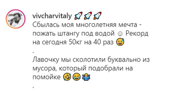 Тренер из Томска Виталий Вивчар побил мировой рекорд по жиму штанги под водой. Он отжал 76 раз штангу весом 50 кг. Свой рекорд Виталий устанавливал на Лебяжьем озере в поселке Победа. Он опубликовал в своем Instagram видео, на котором выполнял "подводное" упражнение.