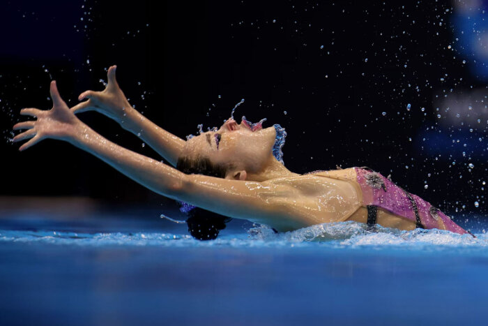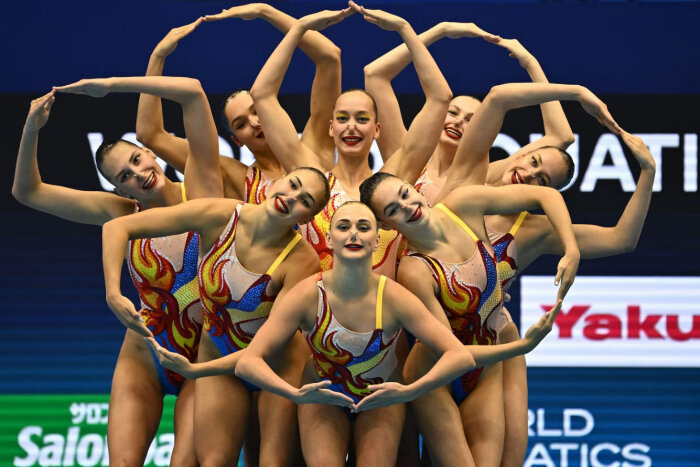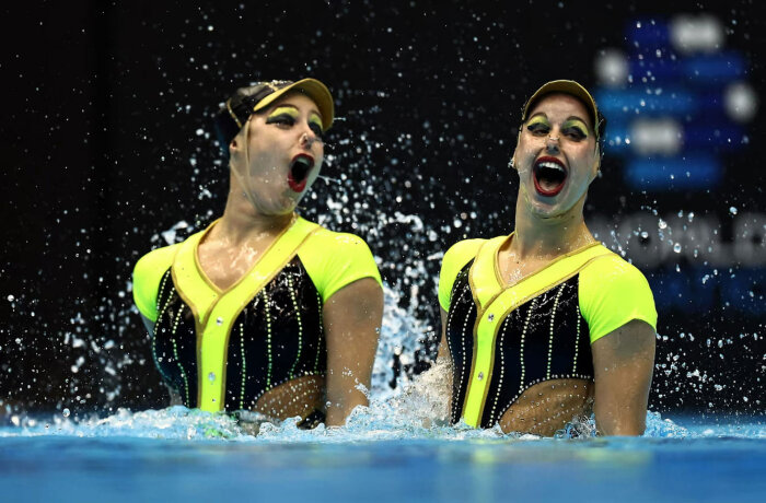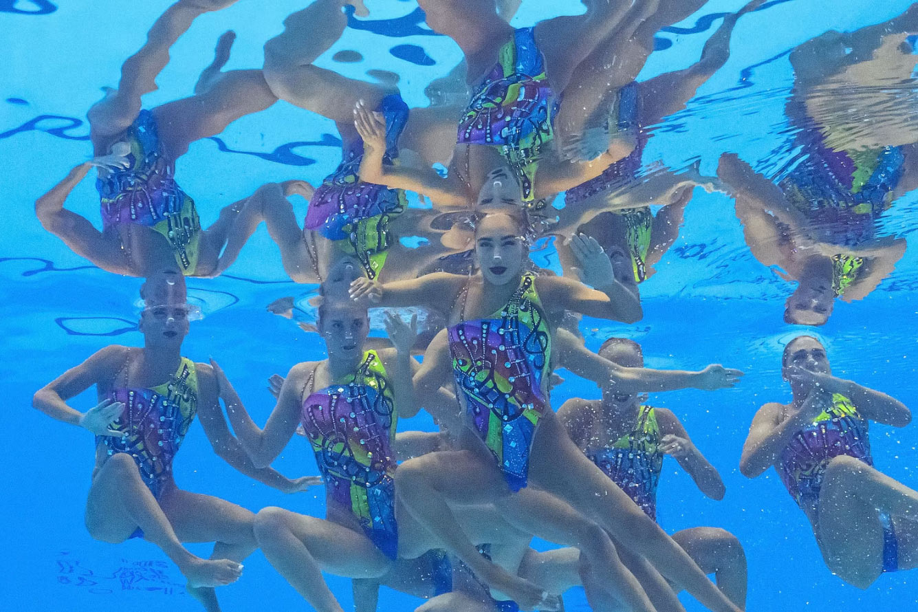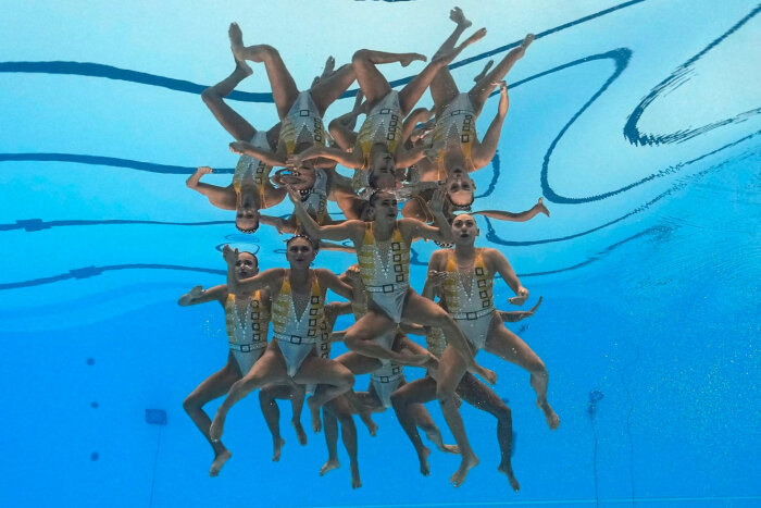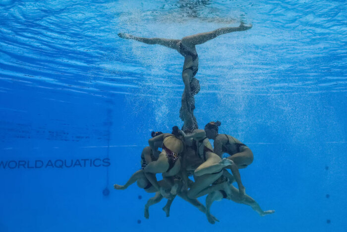 Сборная Украины соревнуется в предварительном раунде соревнований по акробатическому спортивному плаванию. (Фото Philip Fong):
