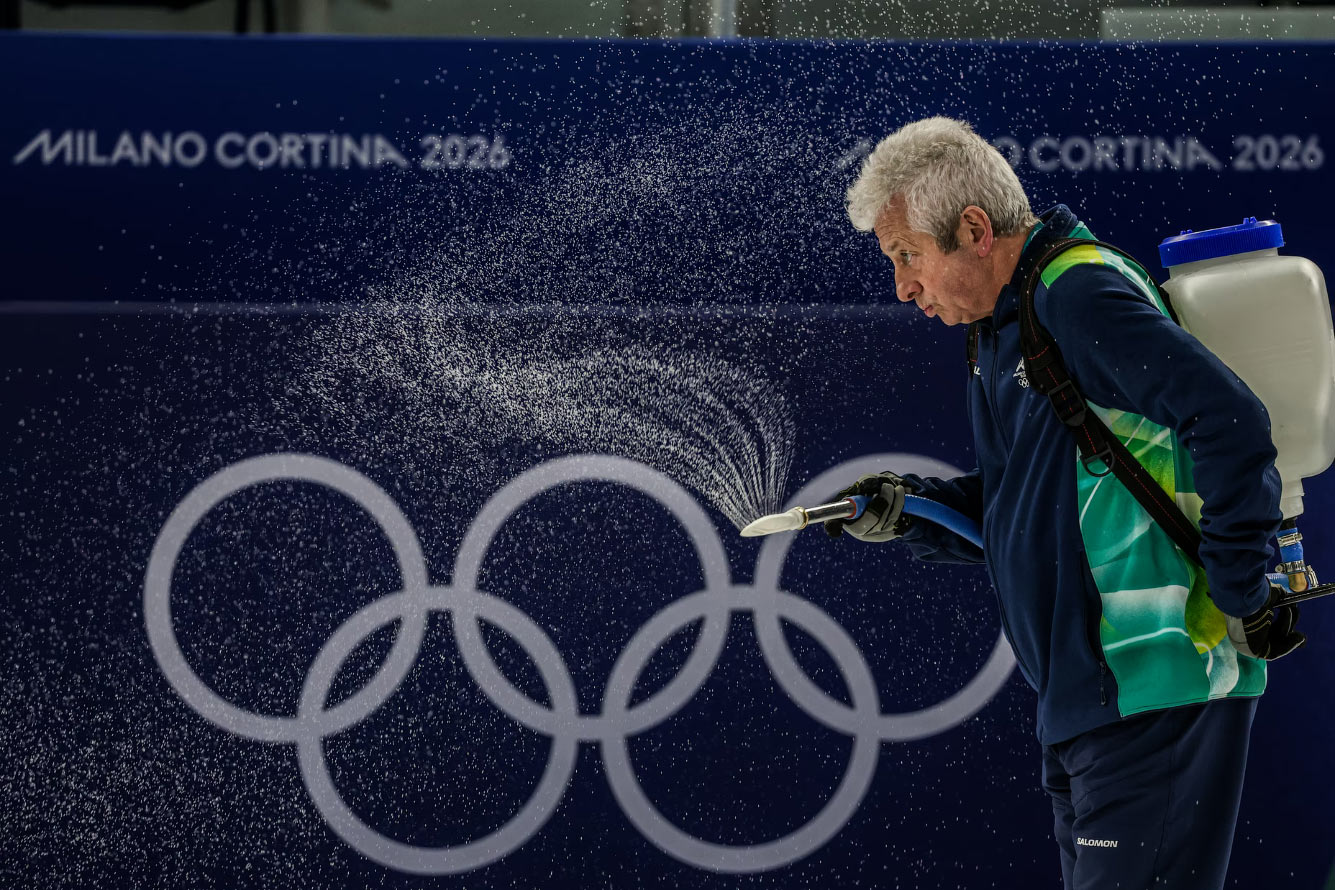 Работник разбрызгивает воду, создавая «шершавую» поверхность льда после соревнований на арене для керлинга в Кортине 9 февраля 2026 года. (Фото Robert Gauthier):