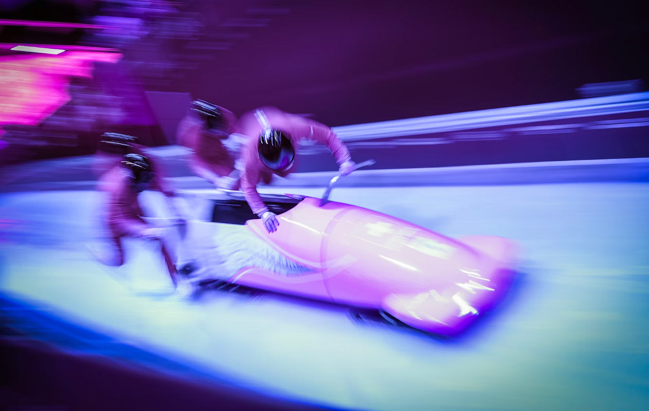 Еще один ИК-снимок, в этот раз фотография швейцарской команды в третьем заезде тренировки по бобслею среди четверок на санной трассе в Кортине 19 февраля 2026 года. (Фото Ryan Pierse):